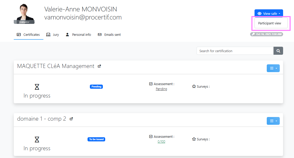 Depending on your settings, your candidates have the possibility to see their current and/or completed certificates but also to see scores, results of evaluation grids or to launch a session or evaluation.