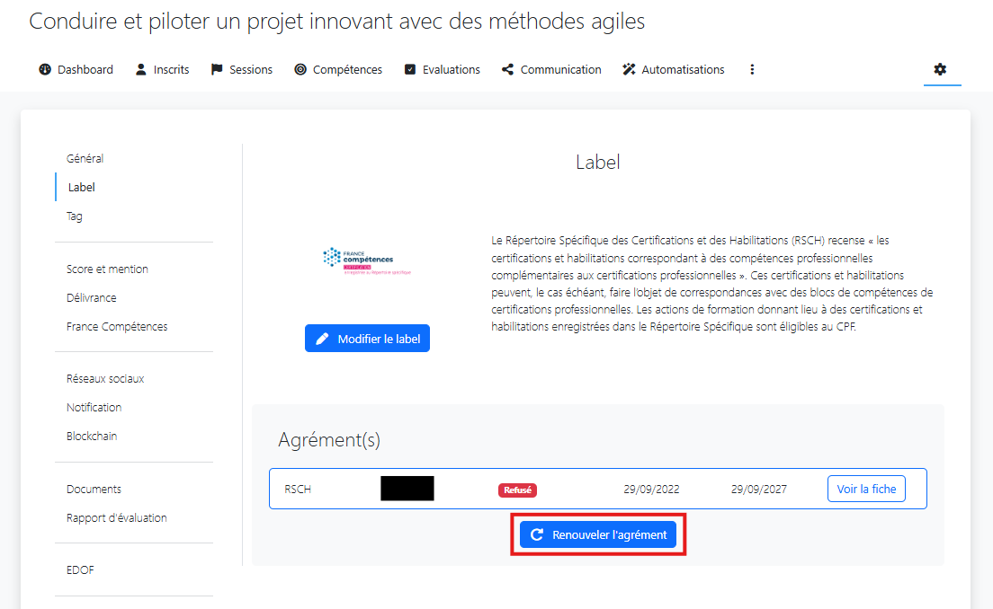 Votre titre France Compétences , vient d’être renouvelé , félicitations ! Vous souhaitez mettre à jour le numéro d’agrément ? Depuis votre certification , cliquez sur l’onglet configuration puis label et enfin renouveler l’agrément. Si , suite à ...