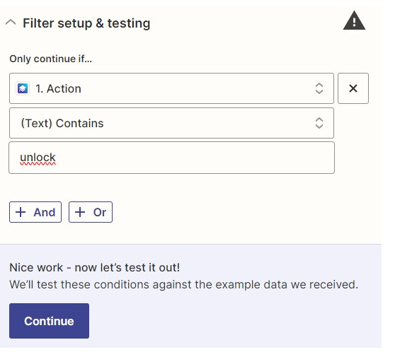 Vous pouvez, par exemple, de choisir de n’écouter que les appels de type "déverrouillage". Pour cela, nous allons paramétrer qu’il nécessaire que l’événement "action" contienne le texte "unlock".
