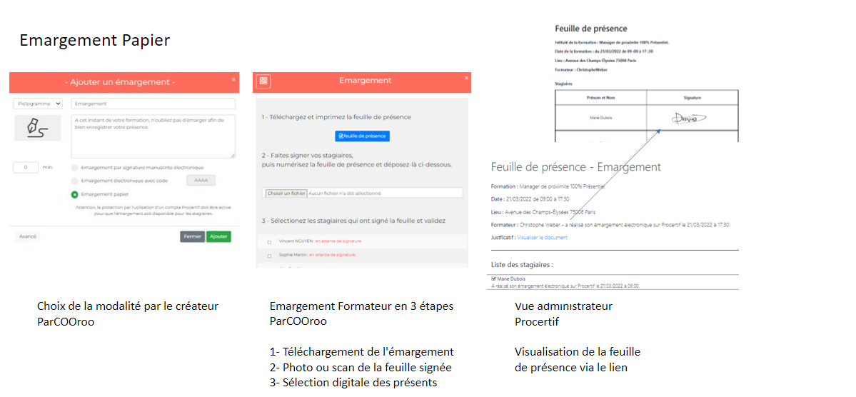 Après sélection de ce mode d’émargement dans ParcOOroo, Téléchargez la feuille de présence pré renseignée des noms des inscrits via Procertif. Des apprenants non inscrits préalablement peuvent être ajoutés manuellement. Scannez ou photographiez la feuille signée par les apprenants. Complétez avec la saisie des inscrits (cases à cocher)