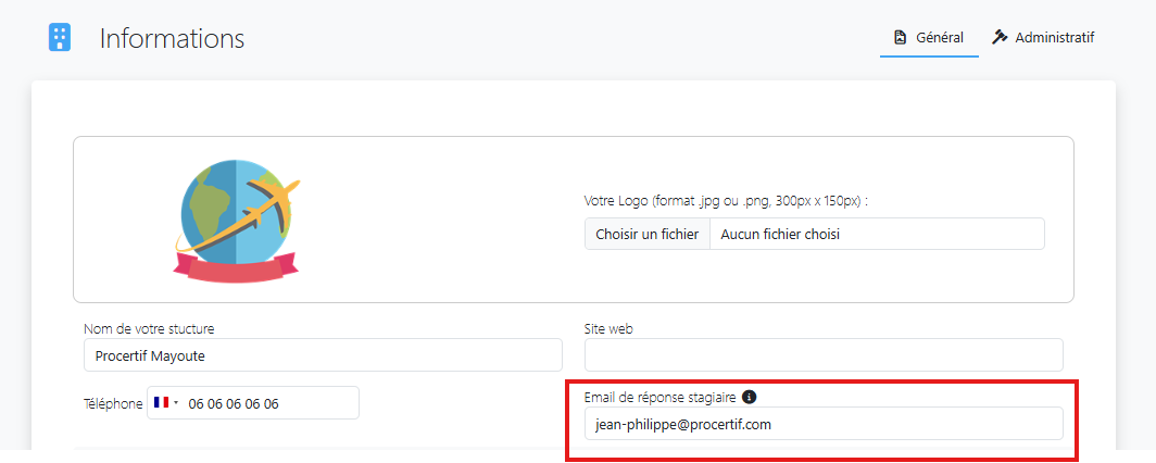 Le nom de votre structure est celui renseigné dans la page "infos générale" et champs "nom de votre structure".